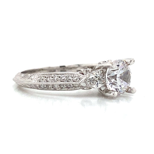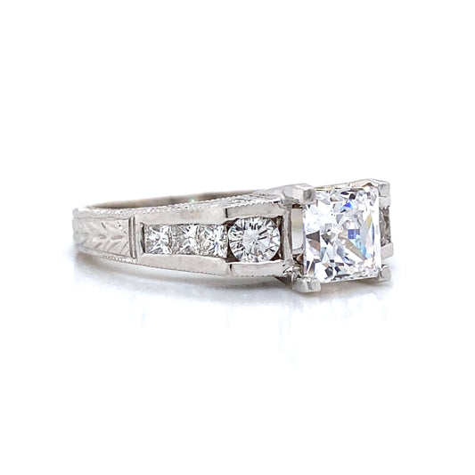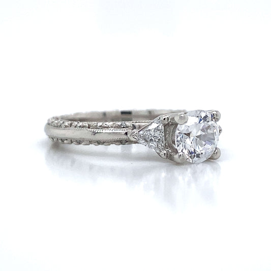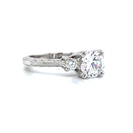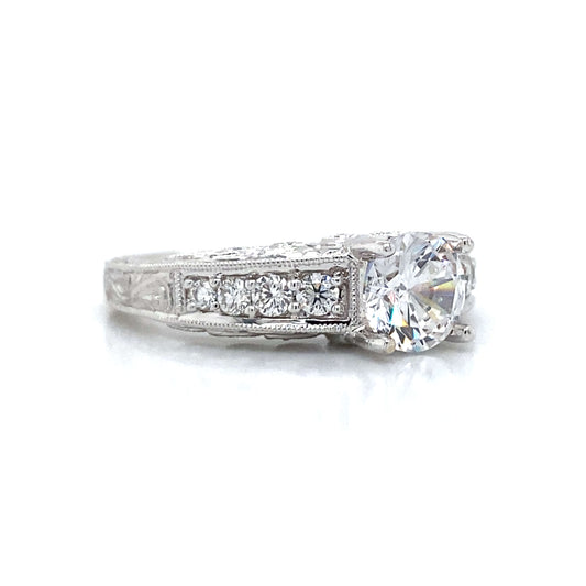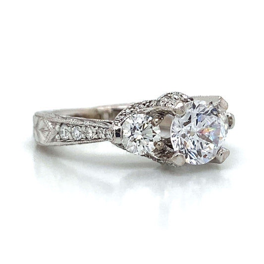 Side Stone Engraved Engagement Ring in 18K White Gold