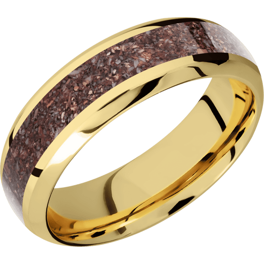 7 mm wide/Domed Bevel/14K Yellow Gold band with one 4 mm Centered inlay of Dinosaur Bone Mixed.