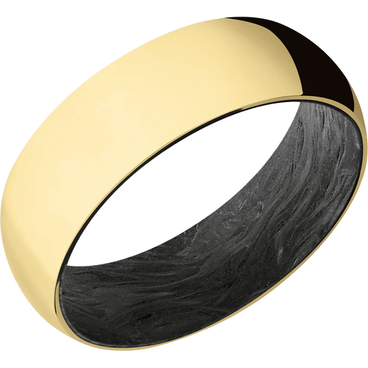 7 mm wide/Domed/22K Yellow Gold band with two 1 mm Double inlays of 14K Yellow Gold also featuring a Forged Carbon Fiber sleeve.
