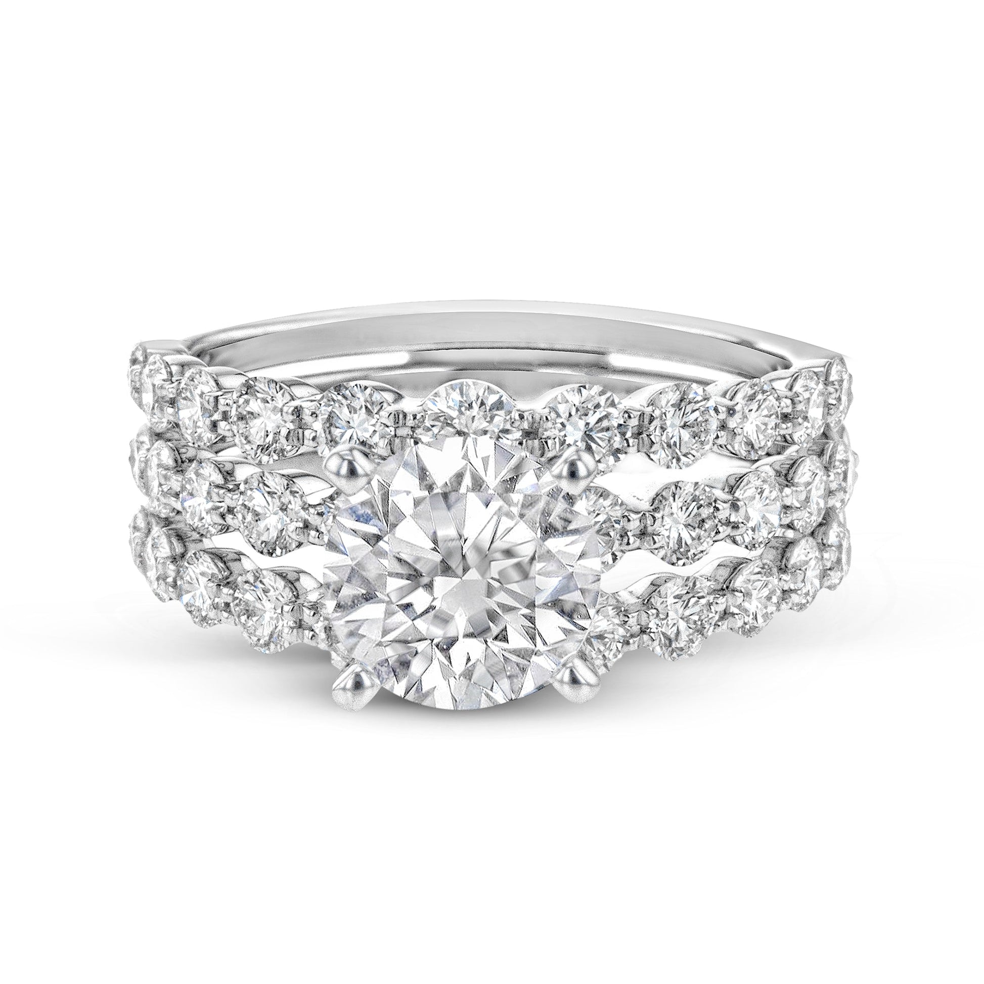 This brilliant wedding set features an intricate design set with three rows of sparkling white diamonds.