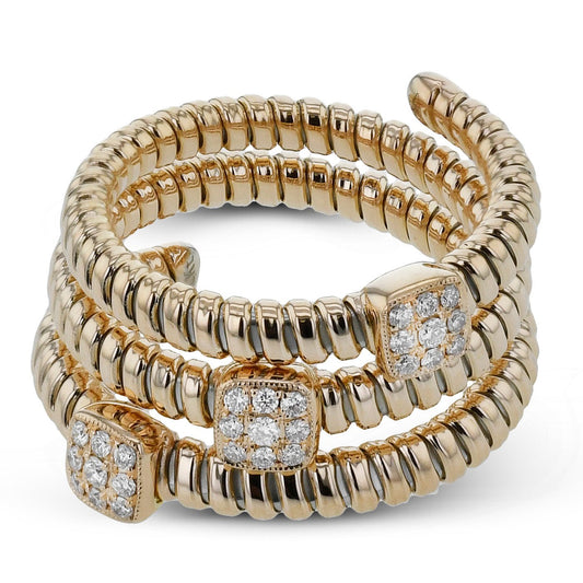 This eye-catching ring features a unique spiral design with three square clusters of sparkling diamonds.