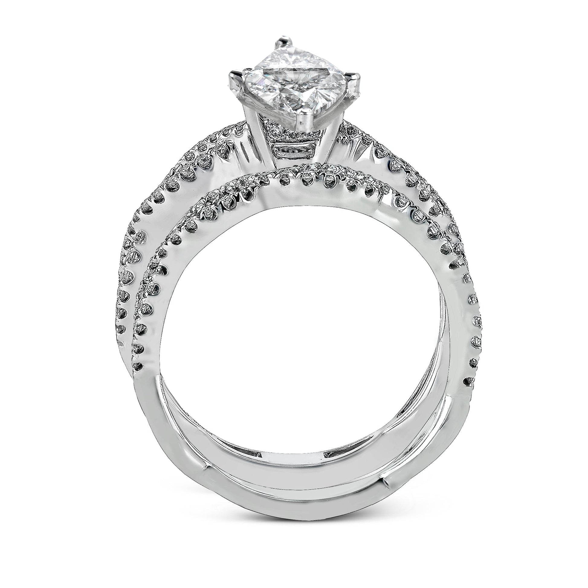 The intricate twist design of this modern wedding set features is adorned with striking white diamonds.