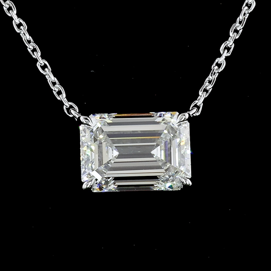 This stunning Solitaire Pendant, crafted in 14K White Gold, features a Prong setting, with Emerald shaped diamonds, totaling 2.02 carats across 1 stones, The diamonds are graded E-F in color and VVS2 in clarity.