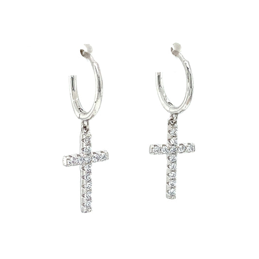Sterling silver huggie hoop earrings with dangle crosses set with CZ's