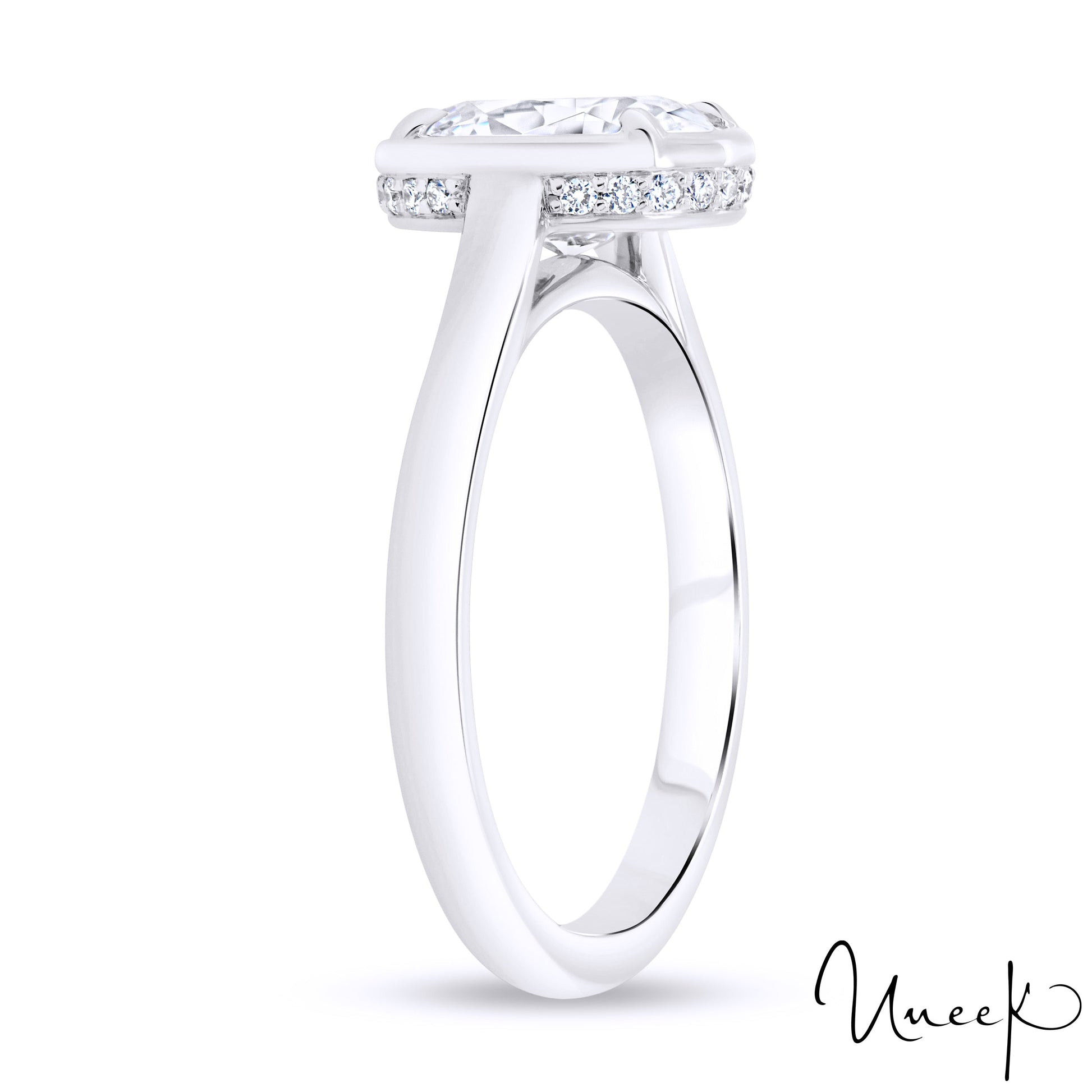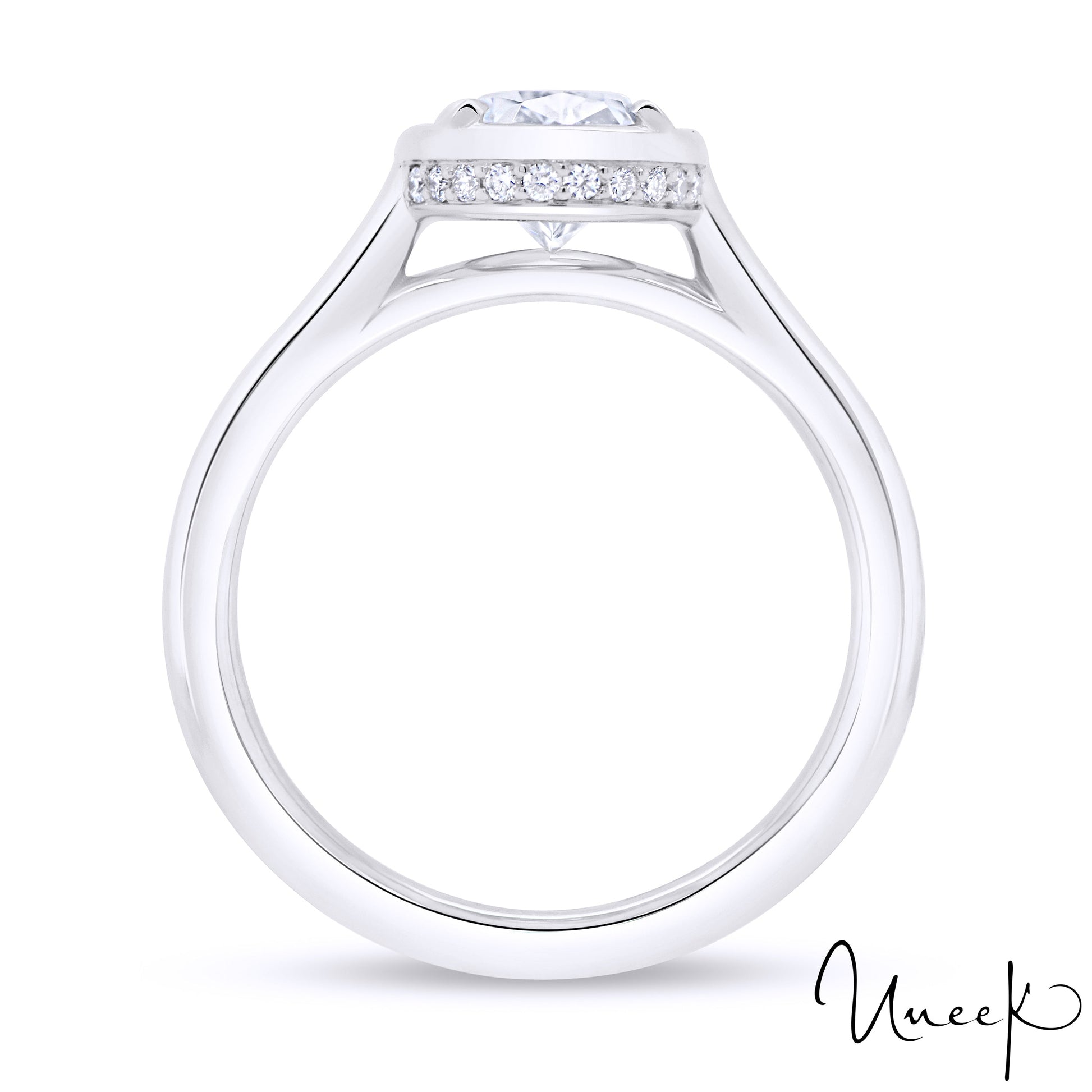 This alexandria collection bezel engagement ring is immaculate for your love one. Outlined with 18 round diamonds weighing 0.09 carats in a classy setting. To fit a 9X7MM oval shaped center