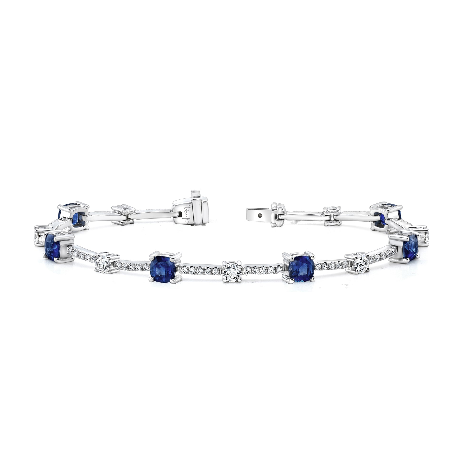 Elegantly understated, this sapphire-and-diamond bracelet is the perfect day-to-night piece for the modern, on-the-go woman; six gorgeous cushion-cut royal blue sapphires alternating with 7 round diamonds create a strikingly chic effect; 89 micropave diamonds line the bars; from Uneek's Royal Blue Collection; a version with high-polish bars is also available, with style # LBR191CU.