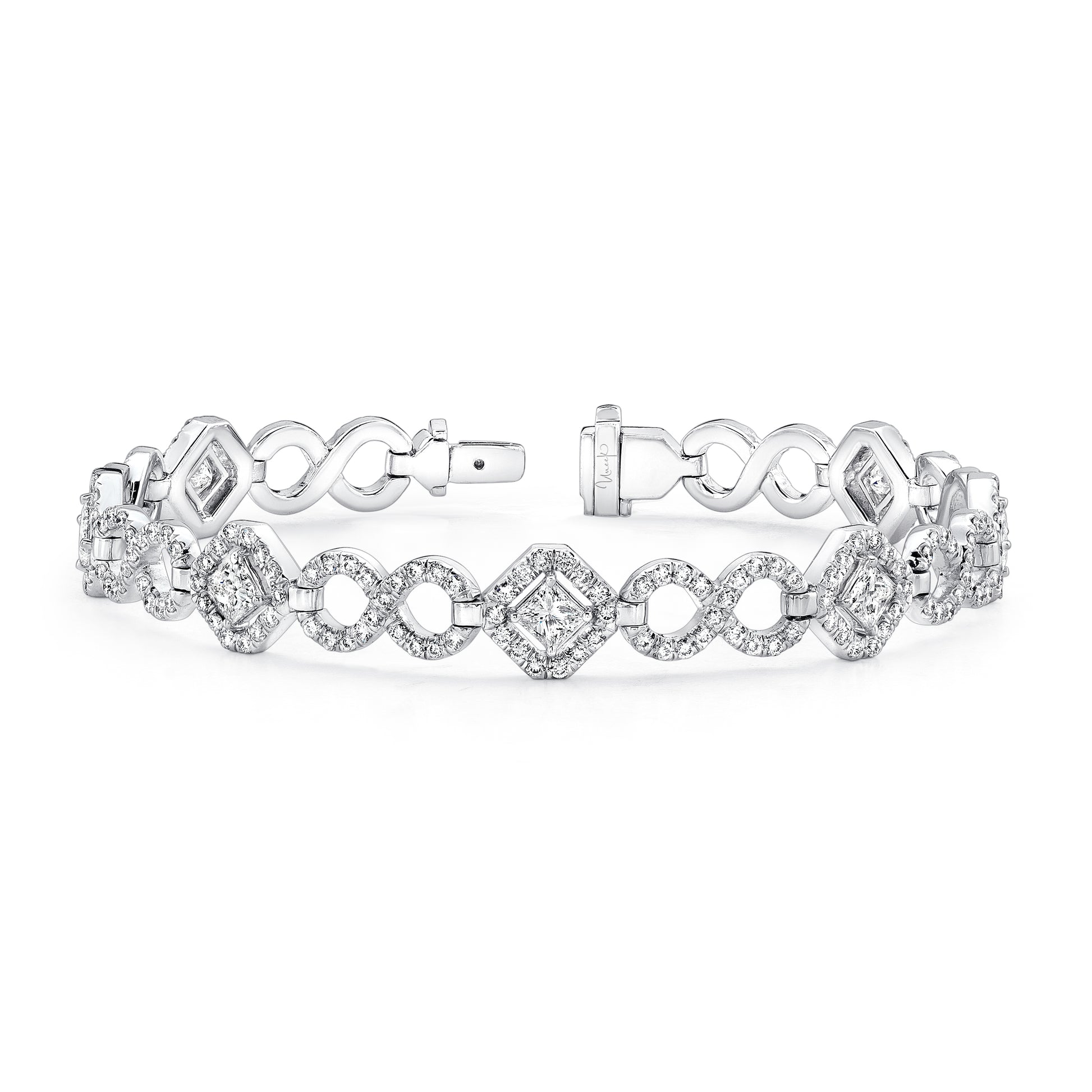 Adorn your wrist with this goregous princess-cut diamond bracelet, featuring seven titled princess-cut diamonds surrounded by asscher-shaped "floating" halos of micropave diamonds, interspaced with infinity-style links (also lined with micropave diamonds); from Uneek's Signature Collection.