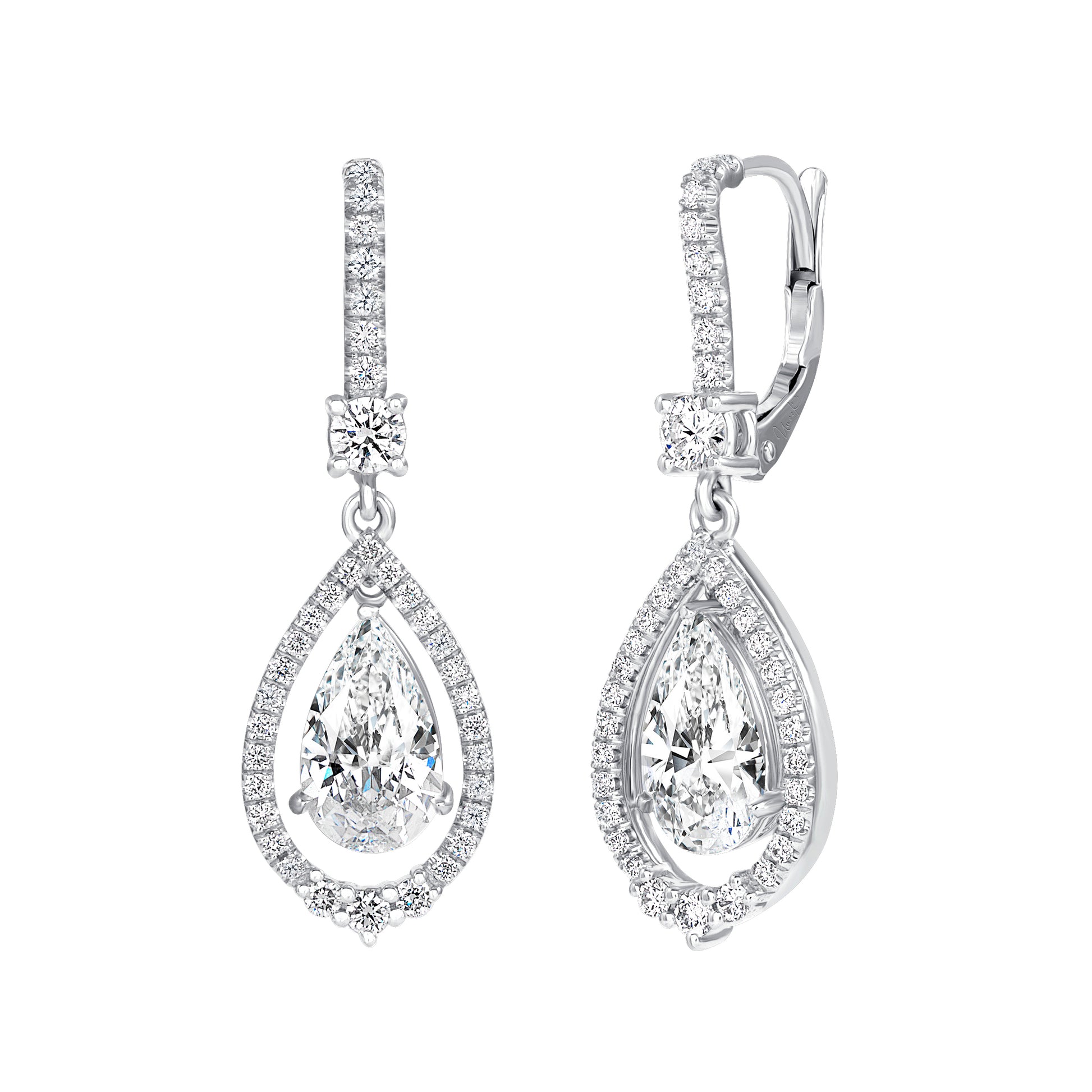 This signature collection halo dangle earrings is flawless for any get up. Designed with 72 round diamonds weighing 0.48 carats, 2 round diamonds with a total weight of 0.22 carats, and 2 pear shaped diamonds with a combined weight of 2.10 carats in a charming design.