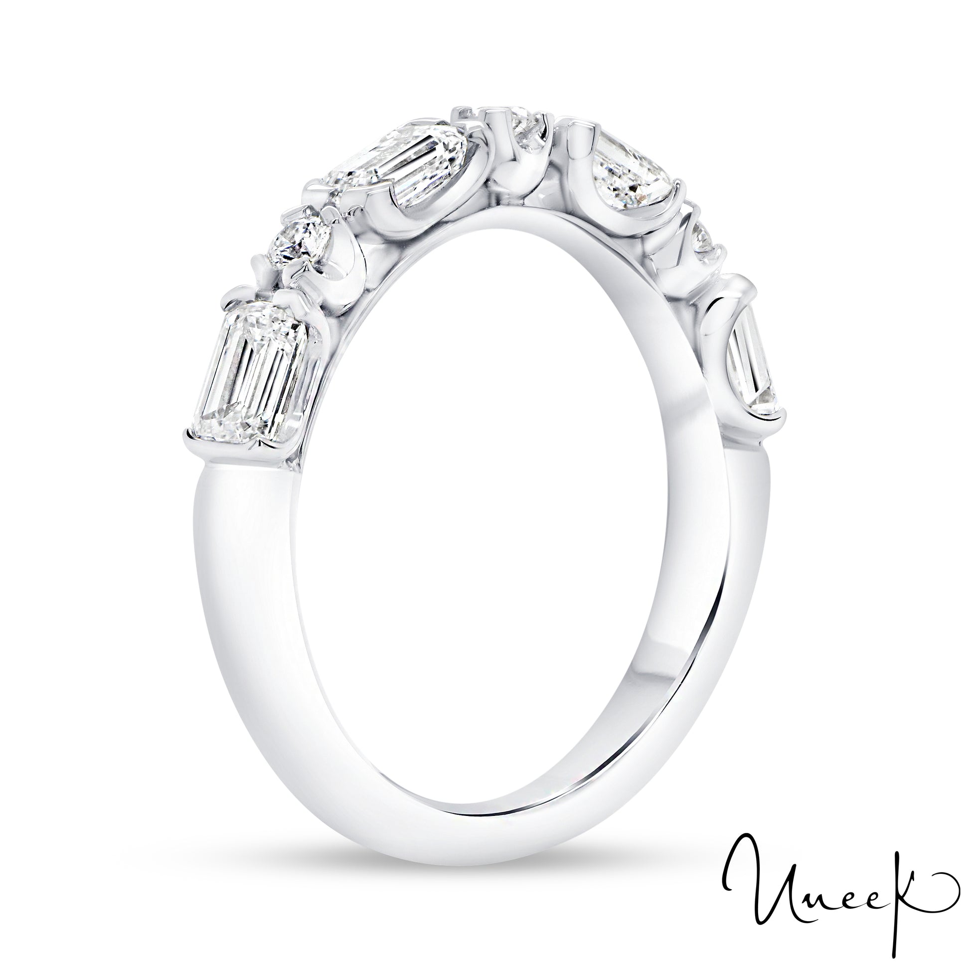This timeless collection emerald cut diamond wedding ring is fine for your other half. Outlined with 3 round diamonds weighing 0.11 carats, and 4 emerald cut diamonds with a total weight of 1.25 carats in an elegant setting.